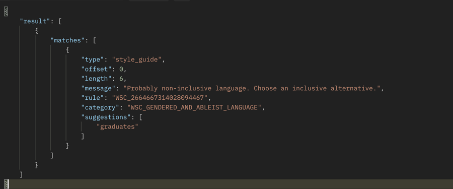 Whereas a rule ID is a unique identifier generated by the server automatically at the time the file is read. It can be learned from the Web API response as ‘rule’ or via browser’s development tools, specifically, inspect element under the ‘data-grammar-rule’. It will have the following format: PREFIX +underscore(_) + up to 20-digit number based on the rule’s pattern. Here is the example of rule ID from the JSON response: "WSC_2664667314028094467".