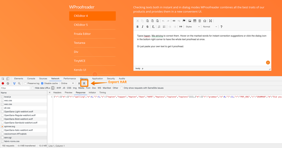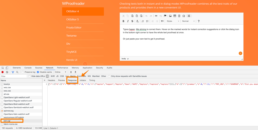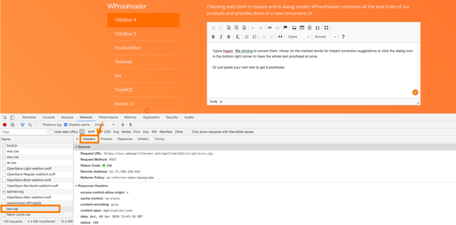 4. Select Network tab and filter by requests to WebSpellChecker. Depending on the deployment option you selected, there might be different entry points to WebSpellChecker: SSRV component (ssrv.cgi) or AppServer.